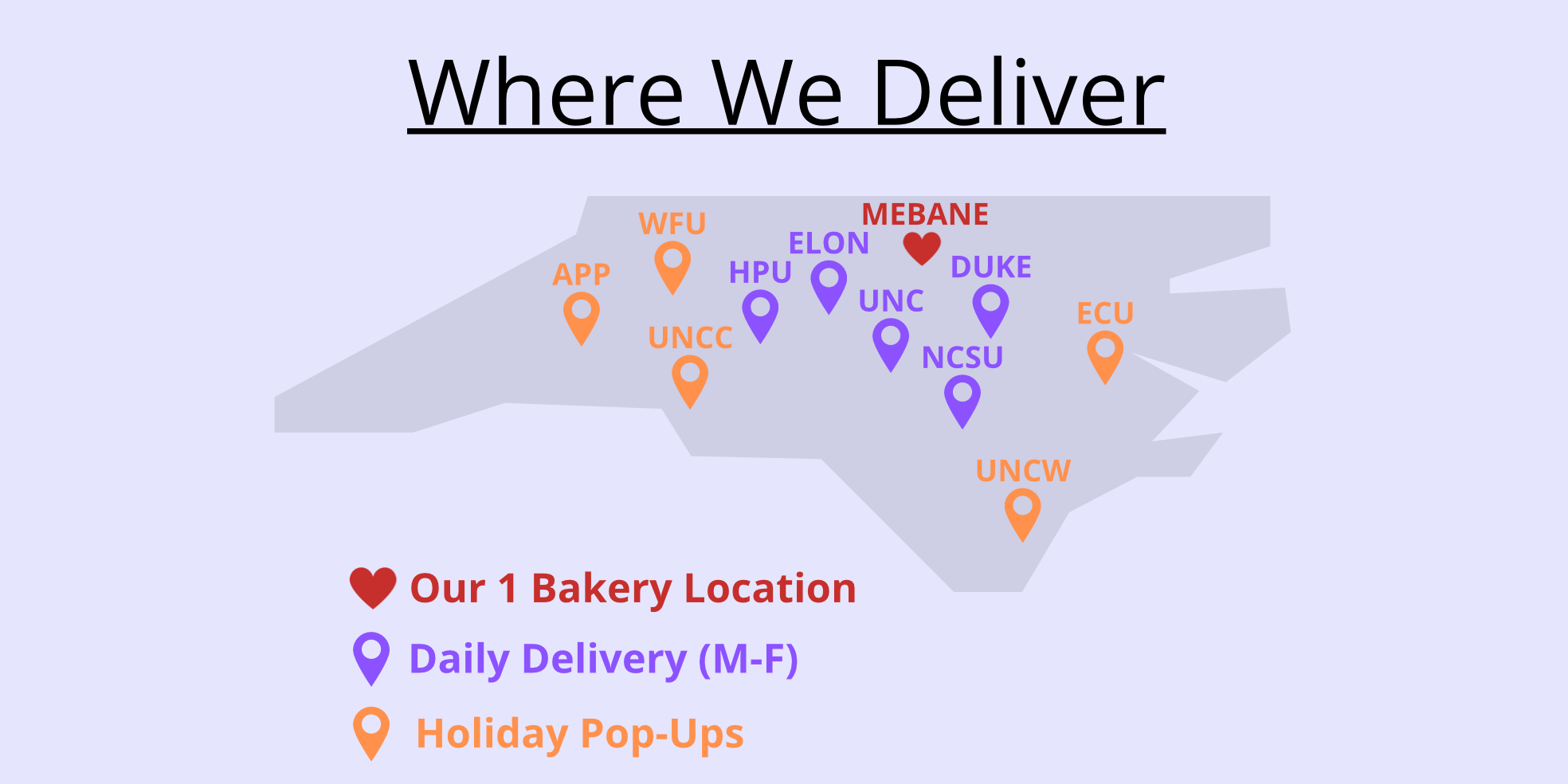Now, we love sharing a taste of home across North Carolina, delivering freshly baked happiness to students at UNC, Duke, NC State, Elon, and High Point. Plus, we host special pop-ups at other universities all over the state!