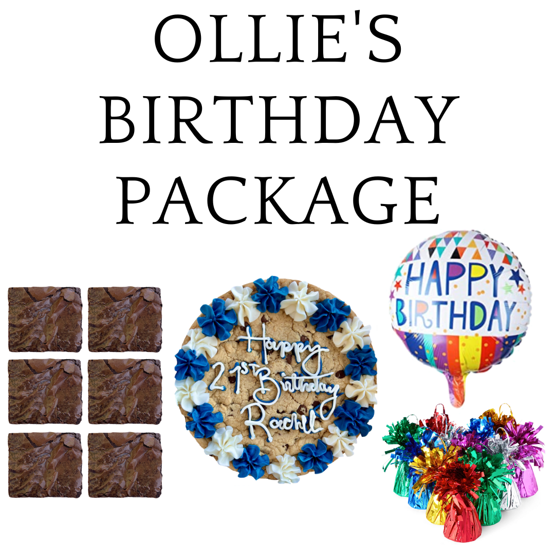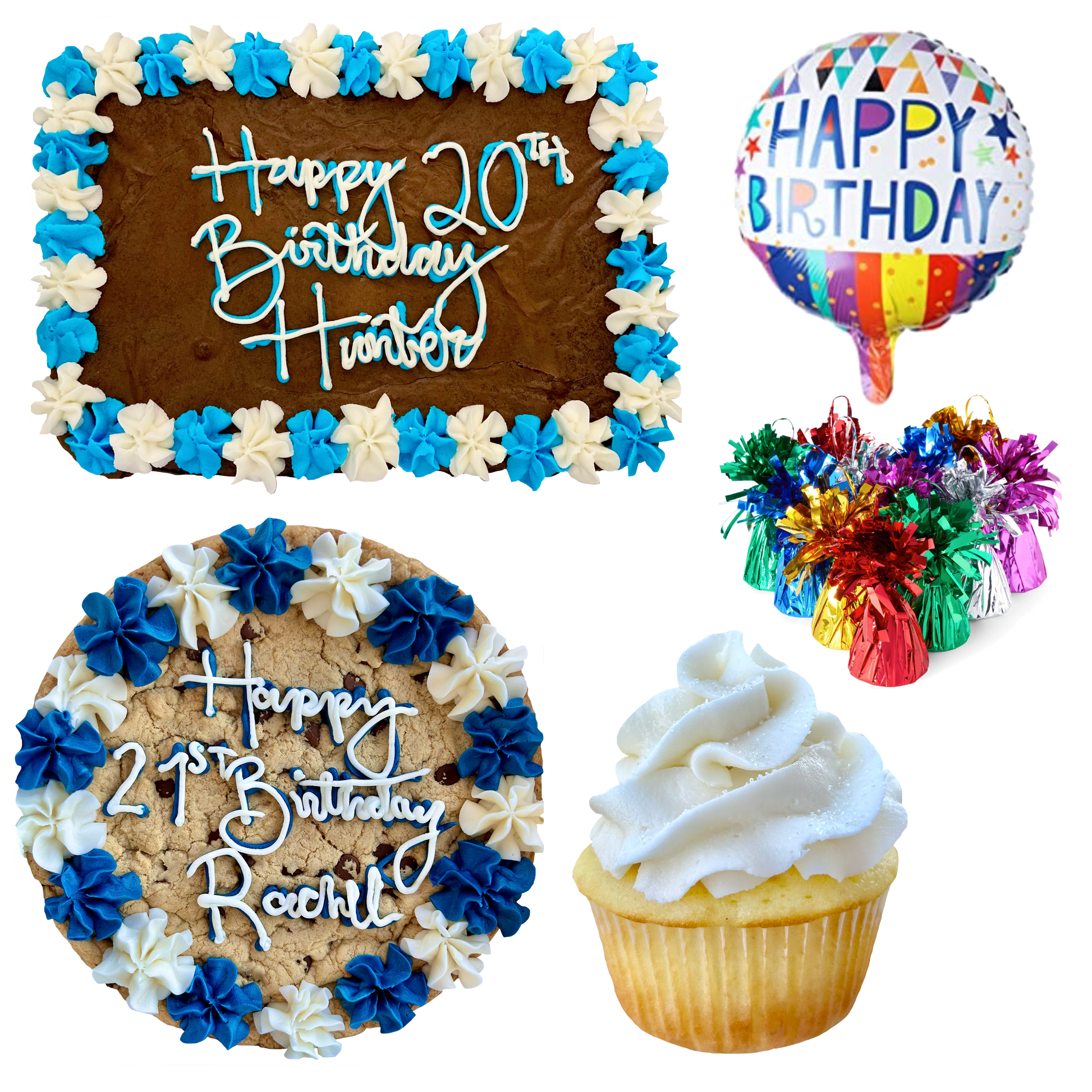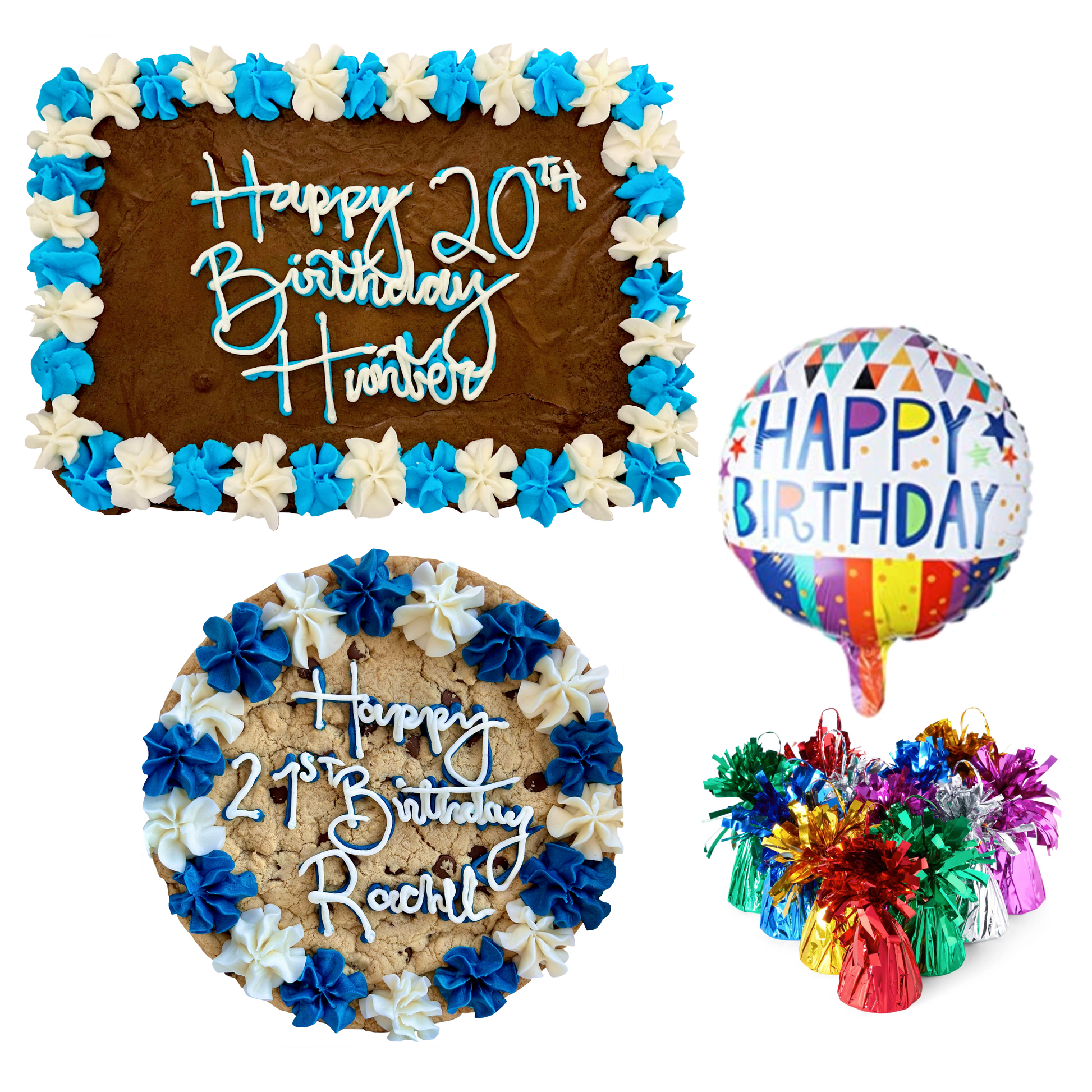 HAPPY BIRTHDAY!!! Our Birthday Package is the perfect way to celebrate a birthday. We offer 3 sizes depending on how many people you'd like to feed! Our standard size easily feeds about 12 people (1 cookie cake + 6 classic brownies + 1 balloon), the large size feeds about 24 people (1 cookie cake + 1 brownie cake + 1 balloon), and the deluxe size feeds about 36 people (1 cookie cake + 1 brownie cake + 12 matching cupcakes + 1 balloon). All our Birthday Packages come with a Happy Birthday balloon (18" helium foil balloon) attached to a balloon weight!