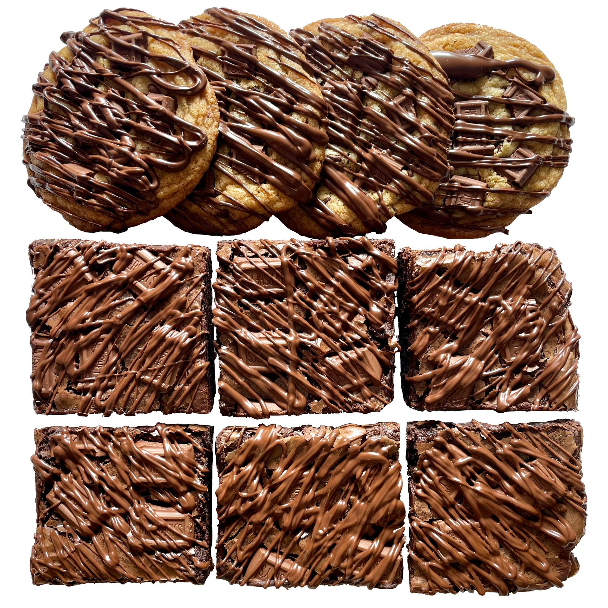 Our Chocoholic Box is the best way to taste our devilishly chocolate flavors! The box comes with 4 large Hershey chunk cookies and 6 huge Hershey chunk brownies. Each cookie is approximately 4” in diameter, jam-packed with a TON of chocolate, hand-rolled and perfectly baked with a soft, chewy center and crisp edge, topped with our double chocolate drizzle and Hershey chunks. Each brownie is huge (approximately 3” x 3” each), filled with a layer of rich chocolate fudge running through the center, and topped with our double chocolate drizzle and Hershey chunks.