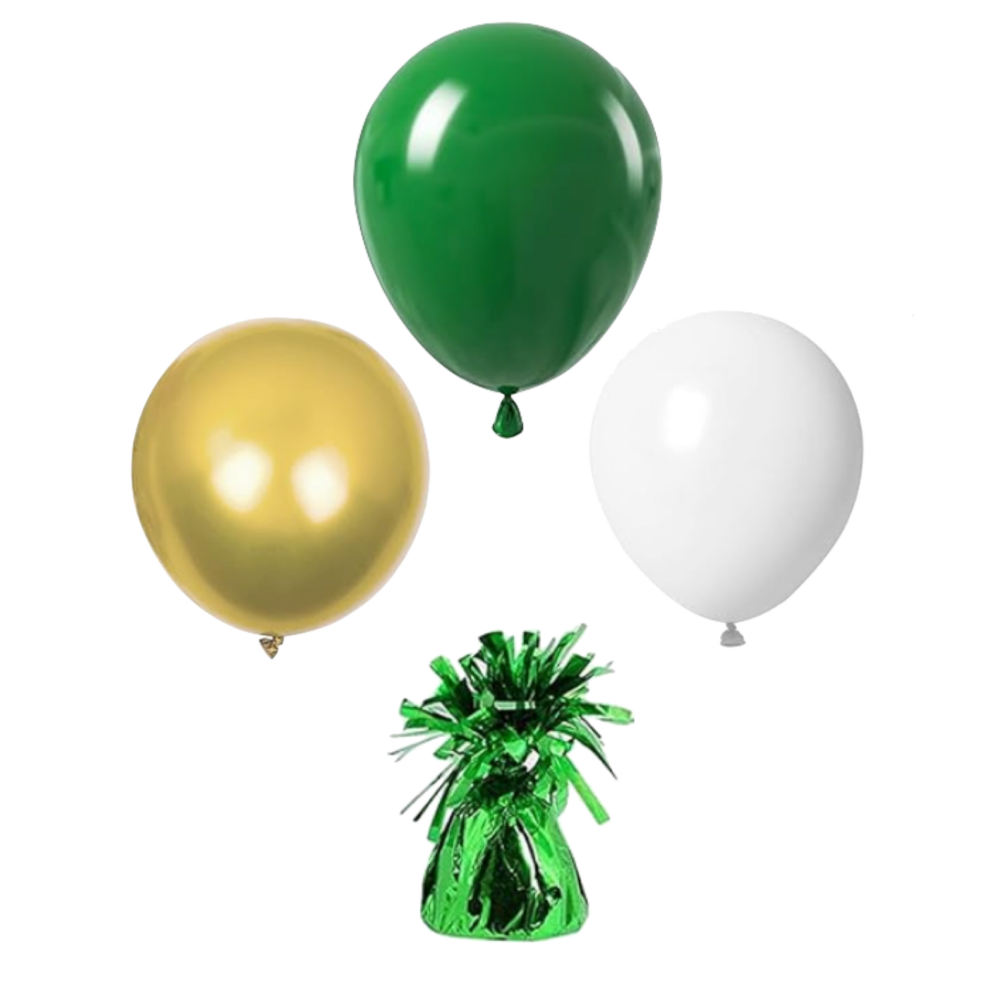 Show some school spirit with our Green Balloon Arrangement! This arrangement comes with 3 total balloons: a green, a white, and a gold balloon all attached to a green balloon weight (each balloon is an 11" or 12" helium-filled latex balloon)!