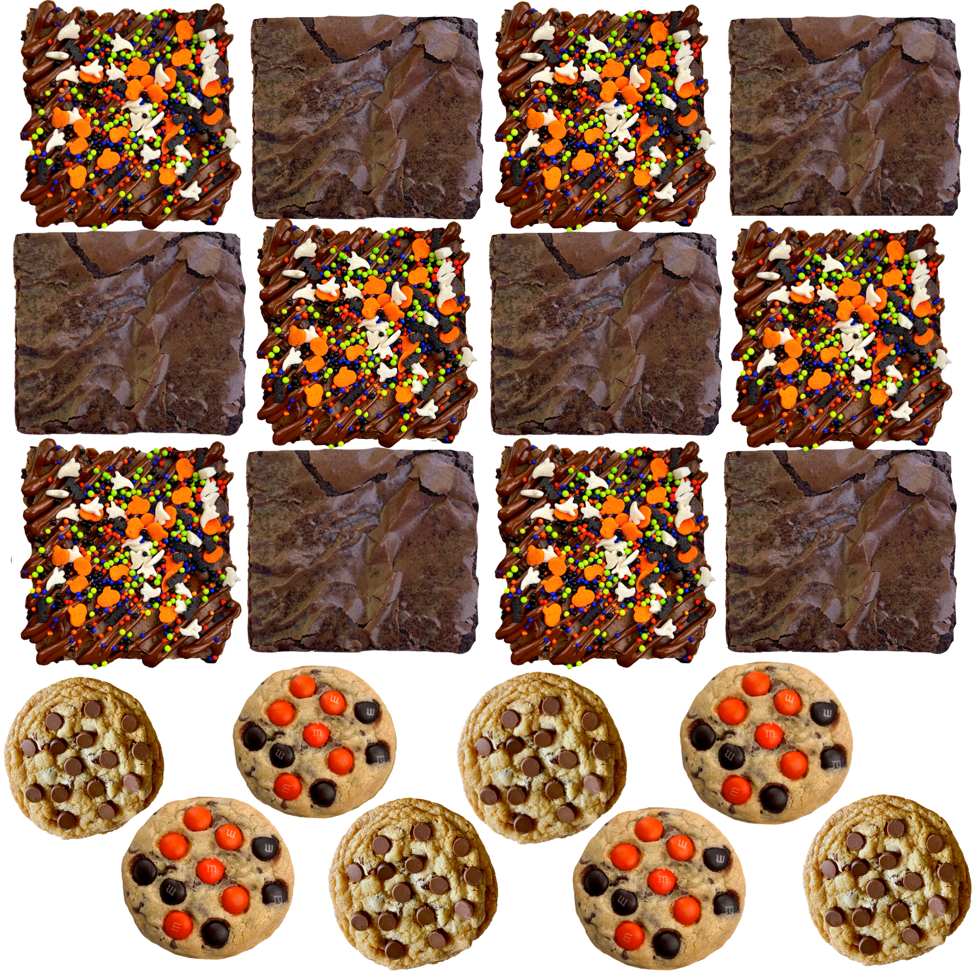 Our Halloween Box is no tricks, all treats! It really is the best way to send some spooky sweets to celebrate Halloween. Each box includes a mix of our chocolate chip cookies, Halloween M&M cookies, classic brownies, and Halloween sprinkle brownies! Choose from 2 different sizes of our delicious Halloween treats: the Standard size comes with 6 brownies + 4 cookies. The Party size comes with 12 brownies + 8 cookies!