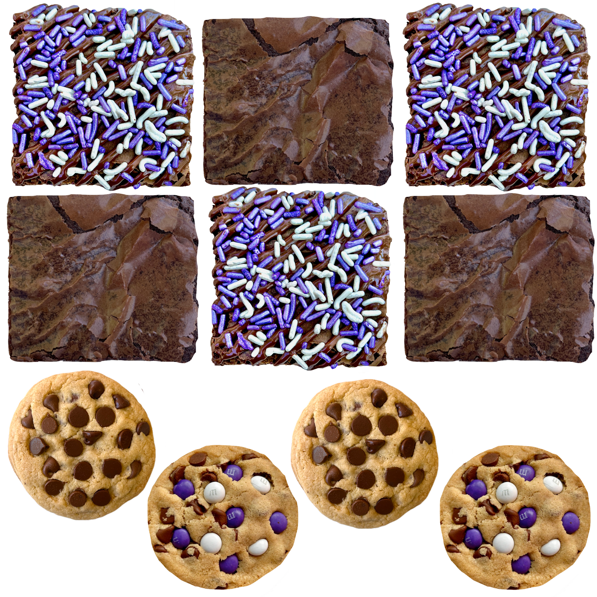 Our Purple Box comes with a mix of 4 cookies and 6 brownies themed in purple and white to create an incredibly stunning (and absolutely delicious) box of goodies! Each large cookie is approximately 4” in diameter, jam-packed with a TON of chocolate, hand-rolled and perfectly baked with a chewy center & chewy edge! We hand-top half the cookies with M&M's (ordered straight from the factory) and the other half with chocolate chips. Each decadently large brownie is approximately 3" by 3” and filled with a layer of rich chocolate fudge running through the center. Specifically, the Purple Box comes with 2 M&M cookies, 2 chocolate chip cookies, 3 classic brownies, and 3 sprinkle brownies.