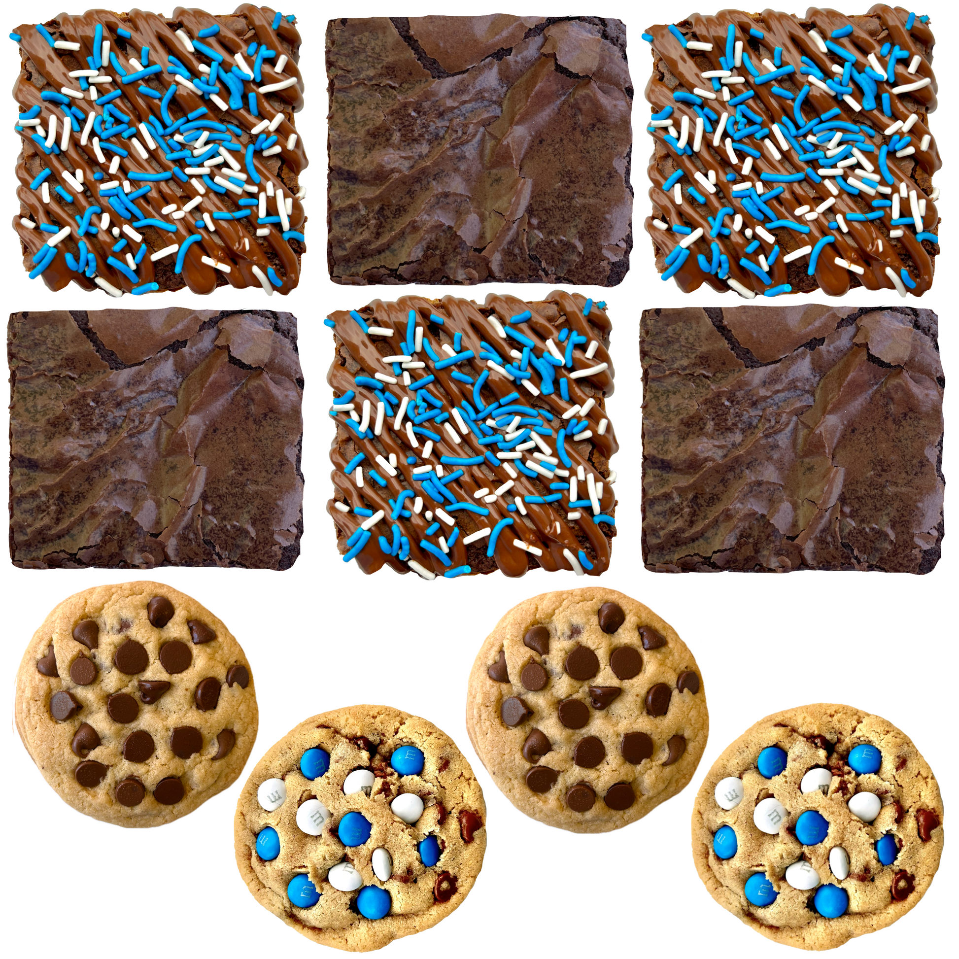 Our Royal Blue Box comes with a mix of 4 cookies and 6 brownies themed in royal blue and white to create an incredibly stunning (and absolutely delicious) box of goodies! Each large cookie is approximately 4” in diameter, jam-packed with a TON of chocolate, hand-rolled and perfectly baked with a chewy center & chewy edge! We hand-top half the cookies with M&M's (ordered straight from the factory) and the other half with chocolate chips. Each decadently large brownie is approximately 3" by 3” and filled with a layer of rich chocolate fudge running through the center. Specifically, the Royal Blue Box comes with 2 M&M cookies, 2 chocolate chip cookies, 3 classic brownies, and 3 sprinkle brownies.