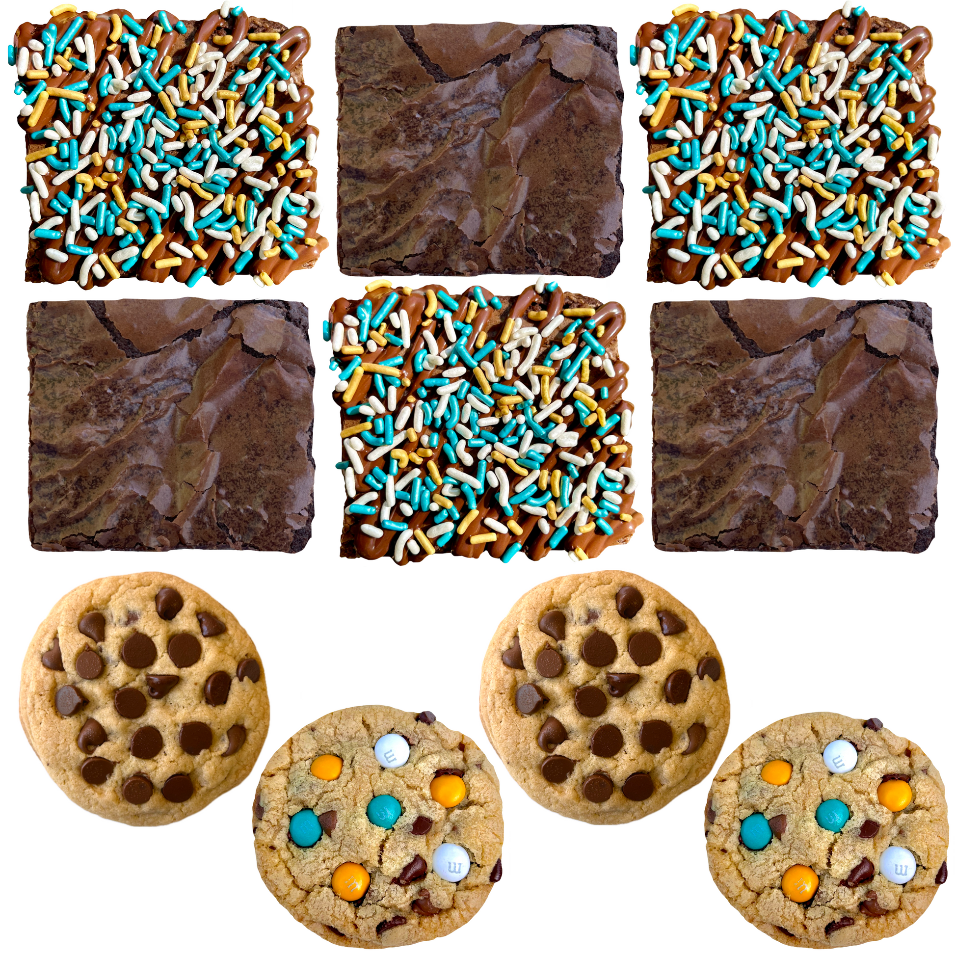 Our Teal Box comes with a mix of 4 cookies and 6 brownies themed in teal, gold, and white to create an incredibly stunning (and absolutely delicious) box of goodies! Each large cookie is approximately 4” in diameter, jam-packed with a TON of chocolate, hand-rolled and perfectly baked with a chewy center & chewy edge! We hand-top half the cookies with M&M's (ordered straight from the factory) and the other half with chocolate chips. Each decadently large brownie is approximately 3" by 3” and filled with a layer of rich chocolate fudge running through the center. Specifically, the Teal Box comes with 2 M&M cookies, 2 chocolate chip cookies, 3 classic brownies, and 3 sprinkle brownies.