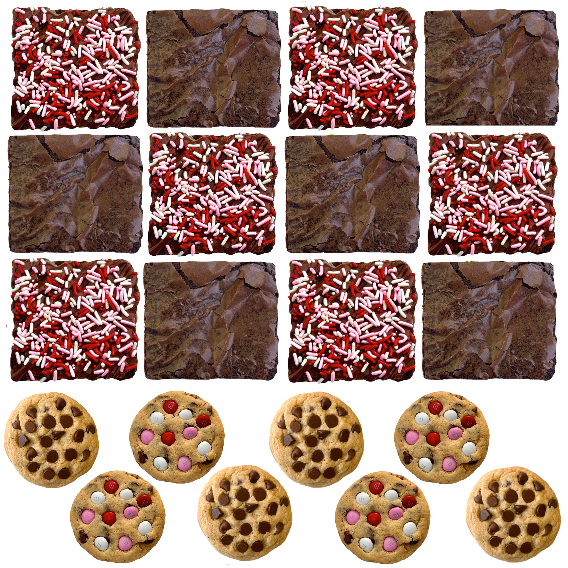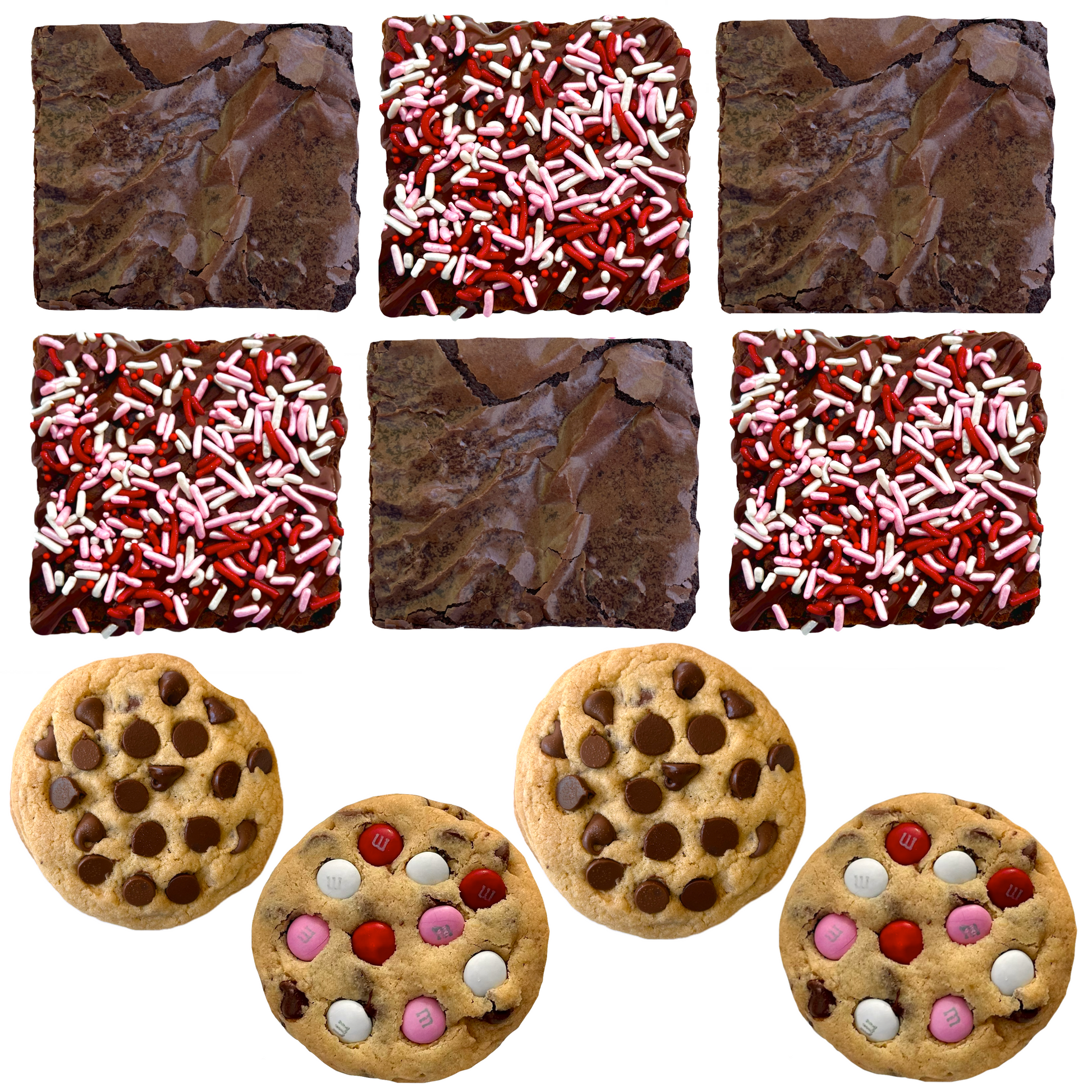 Our Valentine's Box is all love! Each box includes a mix of our chocolate chip cookies, Valentine's M&M cookies, classic brownies, and Valentine's sprinkle brownies! Choose from 2 different sizes of our delicious Valentine's treats: the Standard size comes with 6 brownies + 4 cookies. The Party size comes with 12 brownies + 8 cookies!