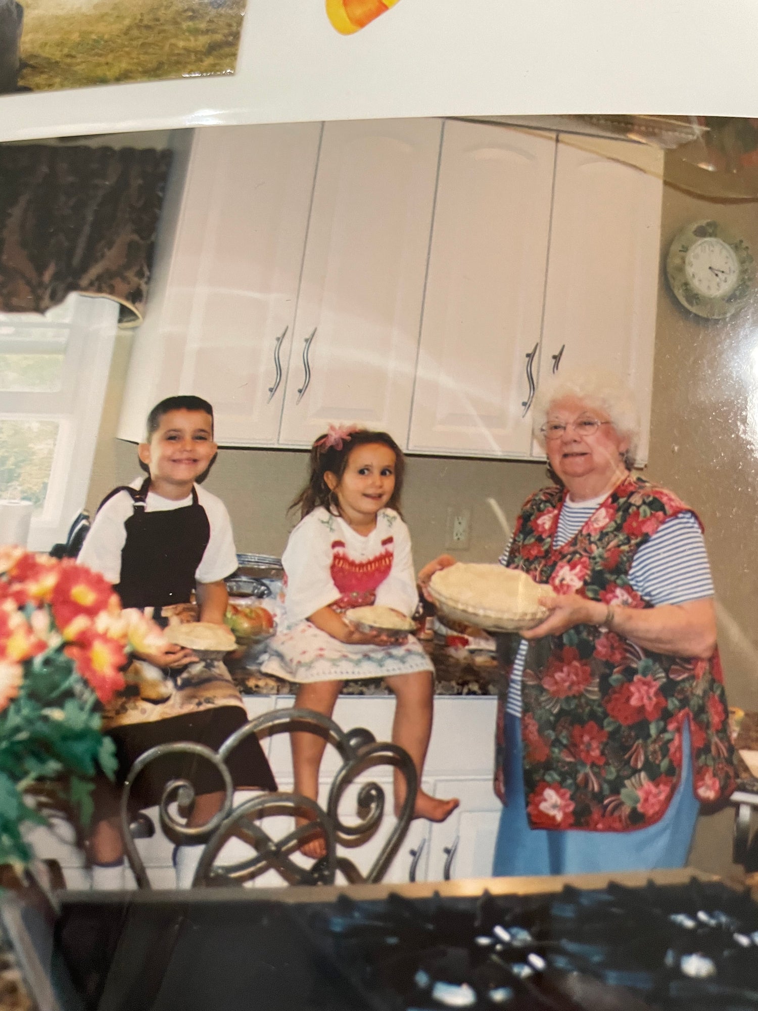 Hey! We’re Camryn & Charlie, the husband-and-wife duo behind Ollie’s Great Bakery. Our bakery is named after Camryn’s great-grandmother Ollie, who sparked his love for baking from a young age (pictured is Camryn, his sister, and Ollie baking pies).